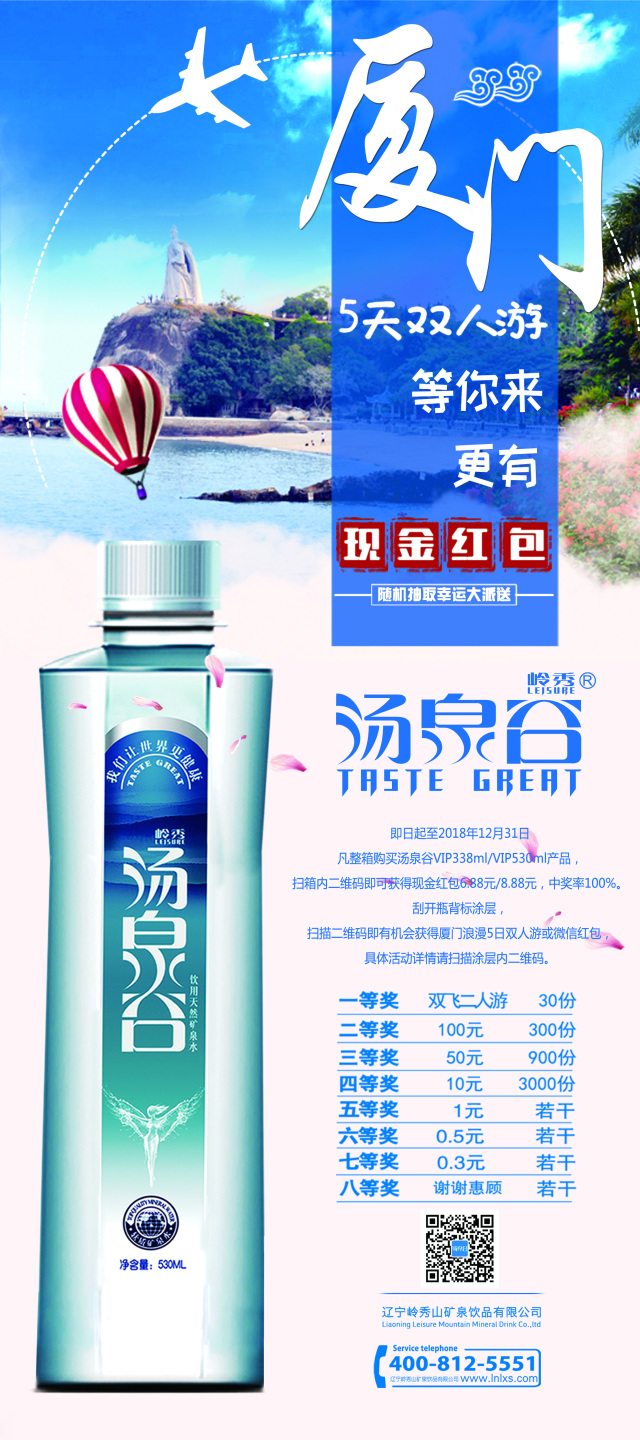 刮开汤泉谷VIP338ml/VIP530ml饮用天然矿泉水瓶身背标涂层,扫描二维码即有机会获得厦门浪漫5日双人游或微信红包。